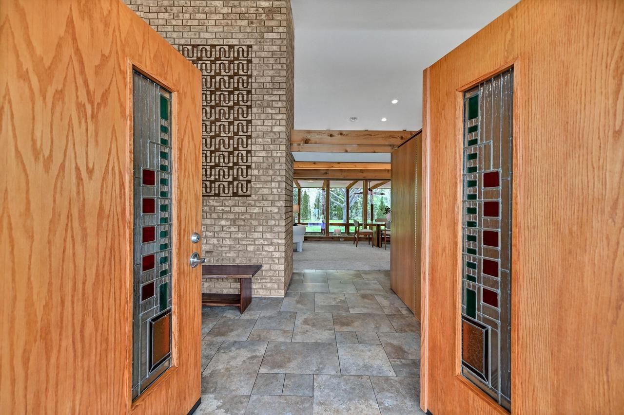 Discover this exceptional Prairie-style home inspired by Frank Lloyd Wright - a striking multi-level design with mid-century modern architecture and walls of windows that bring the outside in. Rich rough-hewn cedar walls with radiant heat throughout create a unique, sensory feel. A brick hearth with skylight anchors the living room, flowing into a dining area and spacious kitchen with island and breakfast bar. A sun-filled solarium connects to the family room with another fireplace, creating ideal gathering spaces. The master suite offers a walk-in closet, while a second bedroom features an attached bath and covered porch. A third bedroom, currently an exercise room, and a fourth near the office share a full bath. 3.5-car attached garage, patio, and swim spa complete this exceptional home.