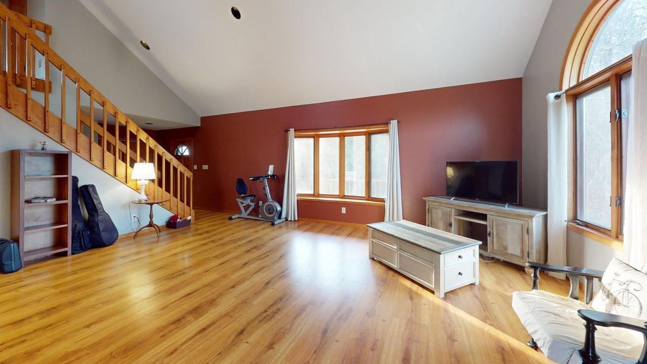 This stunning 3-bedroom, 3.5-bath home sits on over 6 acres of both open and wooded land, with the scenic Melius Creek flowing along the back of the wooded section. The main floor features wood floors and vaulted ceilings, with skylights filling the space with natural light. A staircase leads to a loft overlooking the living room, while the finished basement offers a bar and a ceiling-mounted drop-down projector, making it an ideal spot for entertaining.