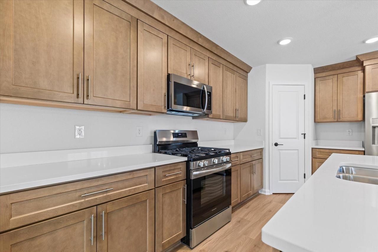 Move-in-ready, new construction. Located 12 minutes off I-94, this comfortable open-concept side-by-side, ranch, split 2-bedroom condominium home features a universal design for ease of living. The kitchen has quartz counters, s.s. appliances, WIP, island w/ seating & dining area. The gathering room has a GFP w/ stone to mantel height, coffered ceiling & patio door leading out to a private patio. The primary bedroom w/ its WIC & private bathroom features a dual vanity w/ quartz counters & 5-ft shower which is located in the rear of the home while a spacious secondary bedroom & hall bath are located at the front. Home has egress window & is plumbed for future bath.