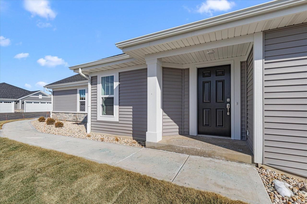 Move-in-ready, new construction. Located 12 minutes off I-94, this comfortable open-concept side-by-side, ranch, split 2-bedroom condominium home features a universal design for ease of living. The kitchen has quartz counters, s.s. appliances, WIP, island w/ seating & dining area. The gathering room has a GFP w/ stone to mantel height, coffered ceiling & patio door leading out to a private patio. The primary bedroom w/ its WIC & private bathroom features a dual vanity w/ quartz counters & 5-ft shower which is located in the rear of the home while a spacious secondary bedroom & hall bath are located at the front. Home has egress window & is plumbed for future bath.