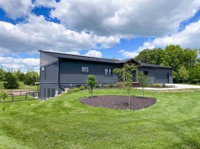 Impressive custom-built (2022) home on 1.9 acres, located just over 1,000 feet from Lake Wisconsin. Designed for entertaining, this home features stunning wooded views through floor-to-ceiling windows with remote-controlled upper blinds. The kitchen offers custom concrete countertops and cabinetry, blending style and function. Enjoy premium mechanical upgrades including radiant in-floor heat, boiler system with rapid hot water, controlled rain shower heads, and a spa-like primary bath with soaking tub. A 2024 solar system ($38,000 value) will be fully paid at closing. Additional highlights include spray foam insulation, composite decking, and a covered lower porch. Basement bonus room offers flexibility for office or wine room. Adjacent 1.95-acre lot available for $100,000 if purchased with home. Sq ft approx; buyer to verify.